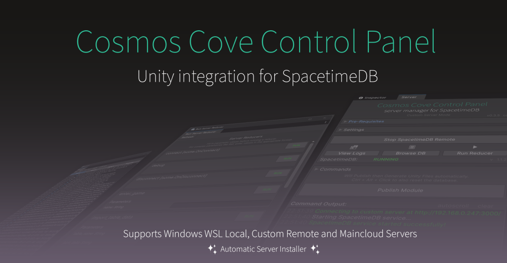 Create your Massively Multiplayer Online Game or 3D Application from the ground up easier than ever with SpacetimeDB using my newly developed server manager Cosmos Cove Control Panel for Unity.